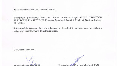 W dniach 22-25.11.2016 r. wzięliśmy udział w X Seminarium Naukowym Zintegrowane Studia Podstaw Deformacji Plastycznej Metali PLASTMET 2016 w Łańcucie. Zaprezentowaliśmy 3 referaty: "Strukturalna i mechaniczna charakterystyka zgrzewów w kształtownikach wyciskanych ze stopów AlMg" (Mgr inż. Alicja Wassermann), "Modelowanie numeryczne MES procesu wyciskania cienkościennych kształtowników otwartych z trudno odkształcalnych stopów AlMg" (Mgr inż. Mateusz Dziki), "Struktura i właściwości mechaniczne wysoko umocnionych stopów AlMg" (Mgr inż. Jacek Madura). Ponadto, w trakcie konferencji odbyło się pierwsze spotkanie w kadencji 2016-20 Sekcji Procesów Przeróbki Plastycznej Komitetu Metalurgii PAN, na którym Dr hab. inż. Dariusz Leśniak, prof. nadzw. odebrał dokument powołania do działalności w ramach w/w organizacji.