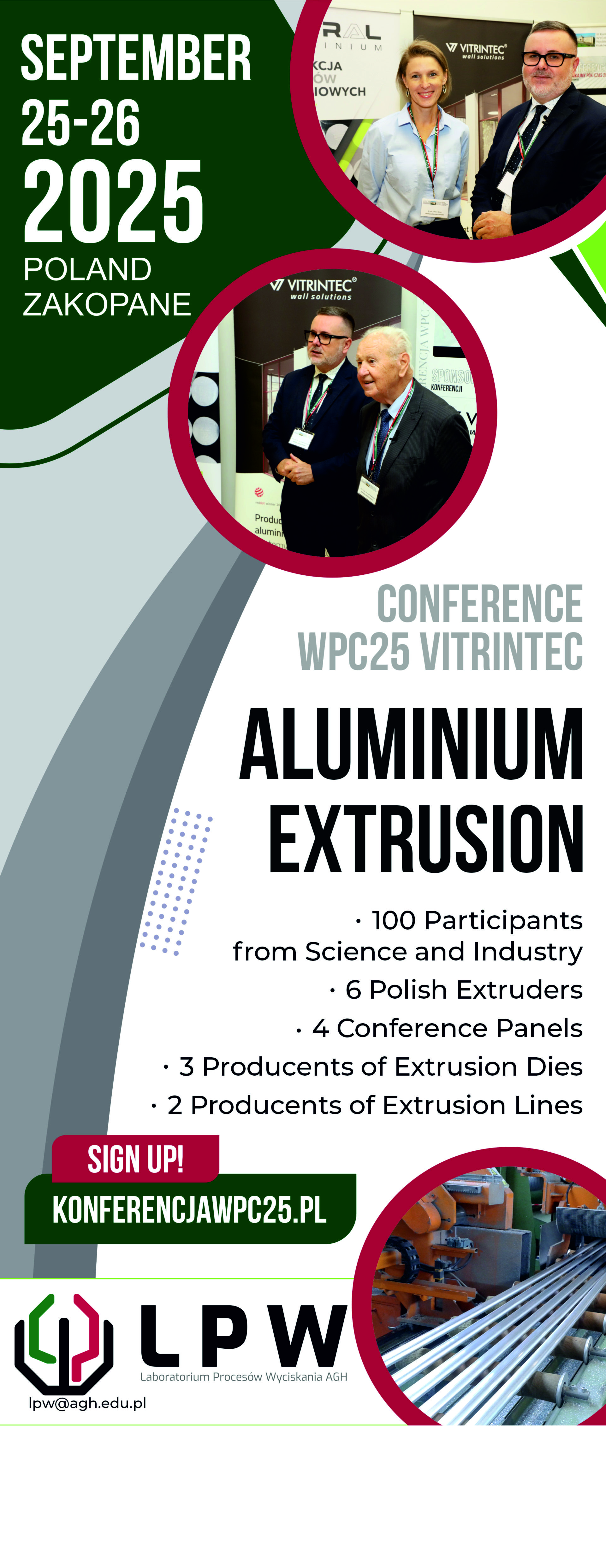 Szanowni Państwo ! Sponsorem tytularnym tegorocznej konferencji WPC25 dotyczącej technologii wyciskania stopów aluminium jest tak jak w zeszłym roku firma Vitrintec- producent nowoczesnych systemów aluminiowo-szklanych. Sponsorami zwykłymi naszego eventu naukowo-biznesowego są firmy: Alusupplies, Cometaleng i QForm Group. Udział w konferencji jak dotąd potwierdziły takie krajowe prasownie jak: Aliplast Extrusion, Extral i Final oraz takie jednostki naukowe jak: Wydział Metali Nieżelaznych AGH, Politechnika Warszawska, Politechnika Częstochowska, czy Sieć Badawcza Łukasiewicz-Poznański Instytut Technologiczny oraz Sieć Badawcza Łukasiewicz-Górnośląski Instytut Technologiczny. Nowością w tym roku jest jednorazowa zmiana miejsca konferencji- tym razem, po 3 latach organizacji konferencji na Wydziale Metali Nieżelaznych AGH, będziemy obradować w nowoczesnym centrum konferencyjnym w Hotelu Nosalowy Dwór Resort and Spa w Zakopanem. Biorąc też pod uwagę Państwa opinie zdecydowaliśmy o formule konferencji co 2 lata- następna konferencja WPC odbędzie się zatem w 2027 roku. W tym roku poznamy trendy i prognozy finansowe na rynku aluminiowych profili wyciskanych w latach 2024-25. Będziemy rozmawiać o zwiększeniu produktywności procesu wyciskania z wykorzystaniem matryc produkowanych zgodnie z technologią AM, nowych rozwiązaniach cyfrowych dla gospodarki obiegu matryc do wyciskania stopów aluminium, symulacjach przepływu aluminium przez matryce, czy o produkcji wlewków aluminiowych do wyciskania: wspólnej realizacji celów w kontekście zielonej transformacji przemysłowej. Pokażemy także najnowsze wyniki testów przemysłowych dla smart die rings, które umożliwiają lepszą kontrolę nagrzewania matryc z przełożeniem na jakość powierzchni profili i żywotność narzędzi. Wierzymy, że w tym trudnym obecnie czasie dla branży aluminium znajdziecie Państwo czas i środki, aby wspólnie współtworzyć przestrzeń do dyskusji na temat innowacji i rozwoju technologii wyciskania stopów aluminium !
